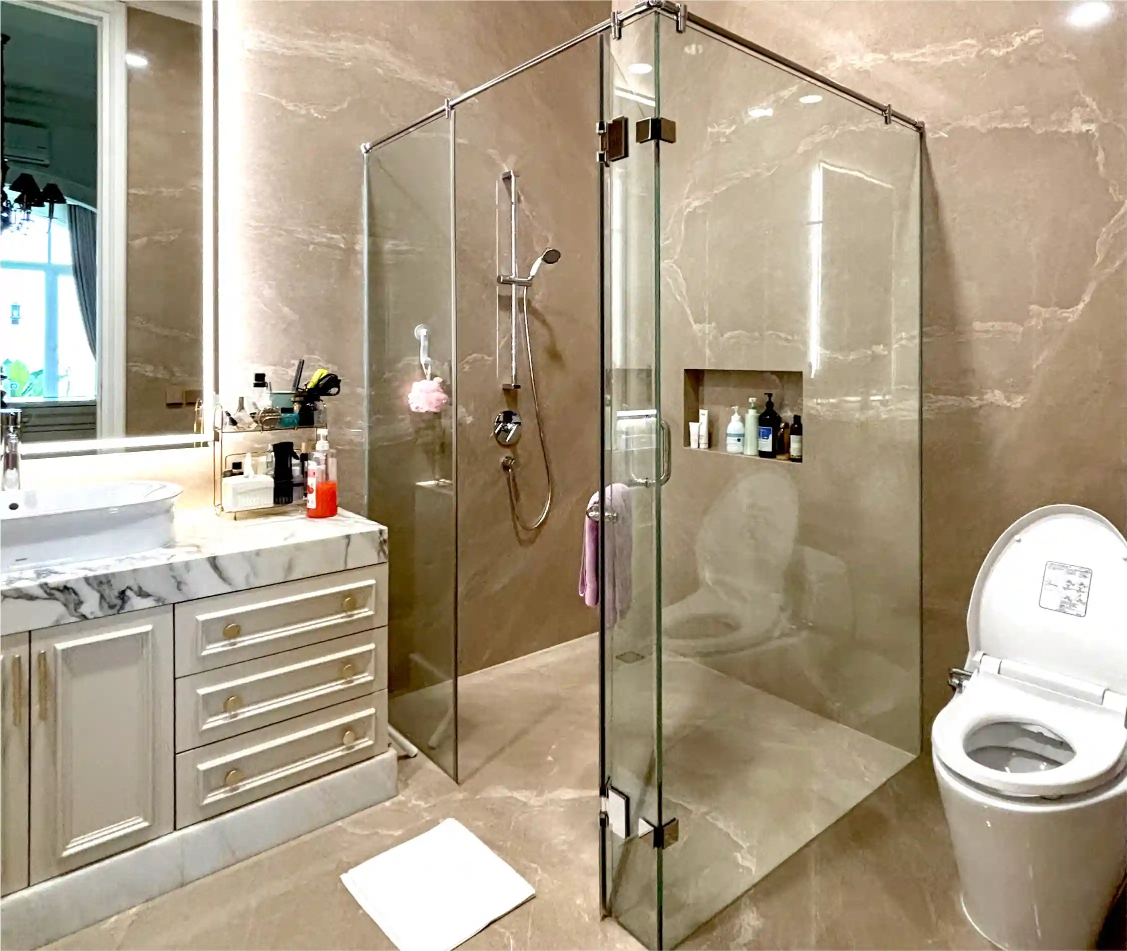 Pilihan umum yang tersedia di pasaran meliputi pintu geser, pintu lipat, hingga pintu recessed yang bisa dilipat rata ke dinding. Untuk kamar mandi yang luas, pintu model buka-tutup konvensional bisa memberikan kesan mewah dan lapang. Namun, di kamar mandi kecil, sistem pintu recessed sangat bermanfaat karena menghemat ruang ketika tidak digunakan.