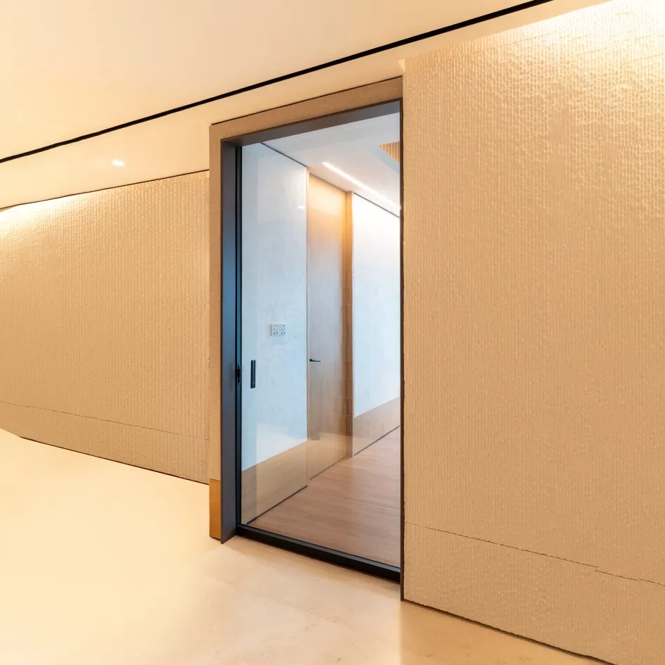 Minimalist glass door with aluminum frame, ideal for lightweight and modern architectural designs. Supports laminated glass, including acoustic glass for optimal sound insulation. Creates an open and spacious feel, perfect for contemporary interiors. Can be used as an interior partition for seamless transitions between spaces or to highlight specific views.