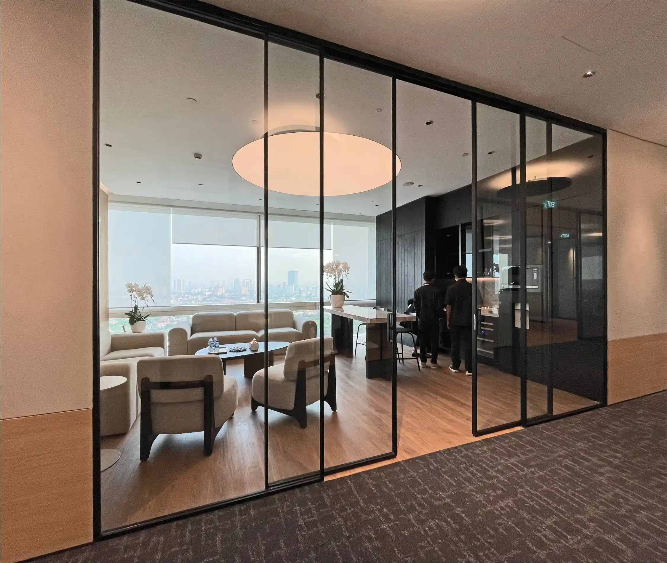 Menggunakan sistem partisi dan pintu kaca dengan profil minimal di atas dan bawah, menciptakan tampilan bersih dan modern tanpa elemen mengganggu. Cocok untuk kantor, ruang meeting, atau area profesional yang ingin terlihat elegan dan rapi.