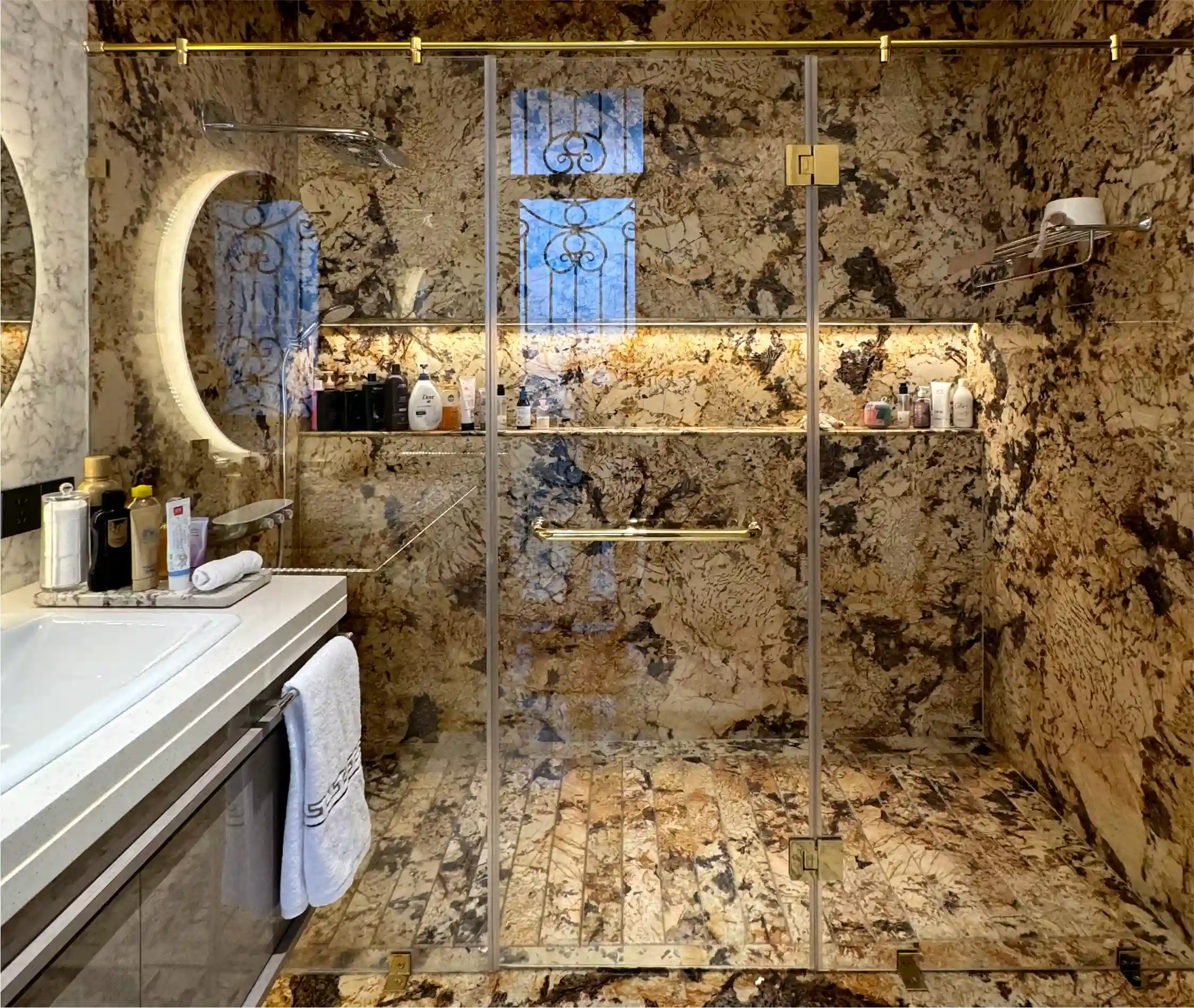 Perpaduan Shower Color Collections menciptakan kesan mewah. Tekstur dan pantulan cahaya menambah nilai estetika pada partisi dan railing kaca.
