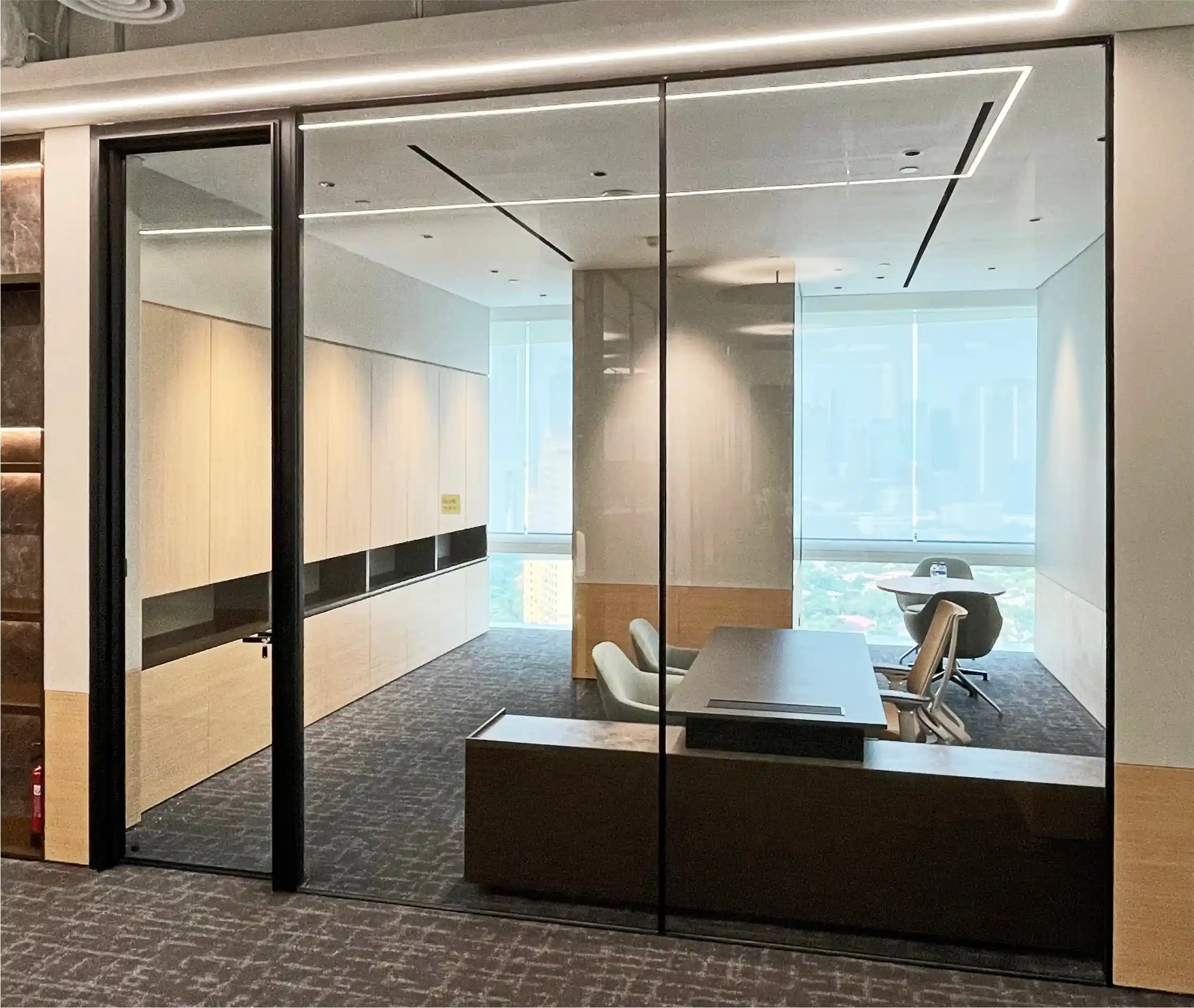 Pada proyek Provident Jakarta, Roxy Glass memperkenalkan Slim Office sebagai solusi partisi modern untuk ruang kantor. Dengan desain ramping dan elegan, Slim Office memberikan pembagian ruang yang efisien tanpa mengurangi kesan terbuka. Kaca ini menciptakan suasana profesional, terang, dan nyaman, ideal untuk lingkungan kerja yang dinamis.