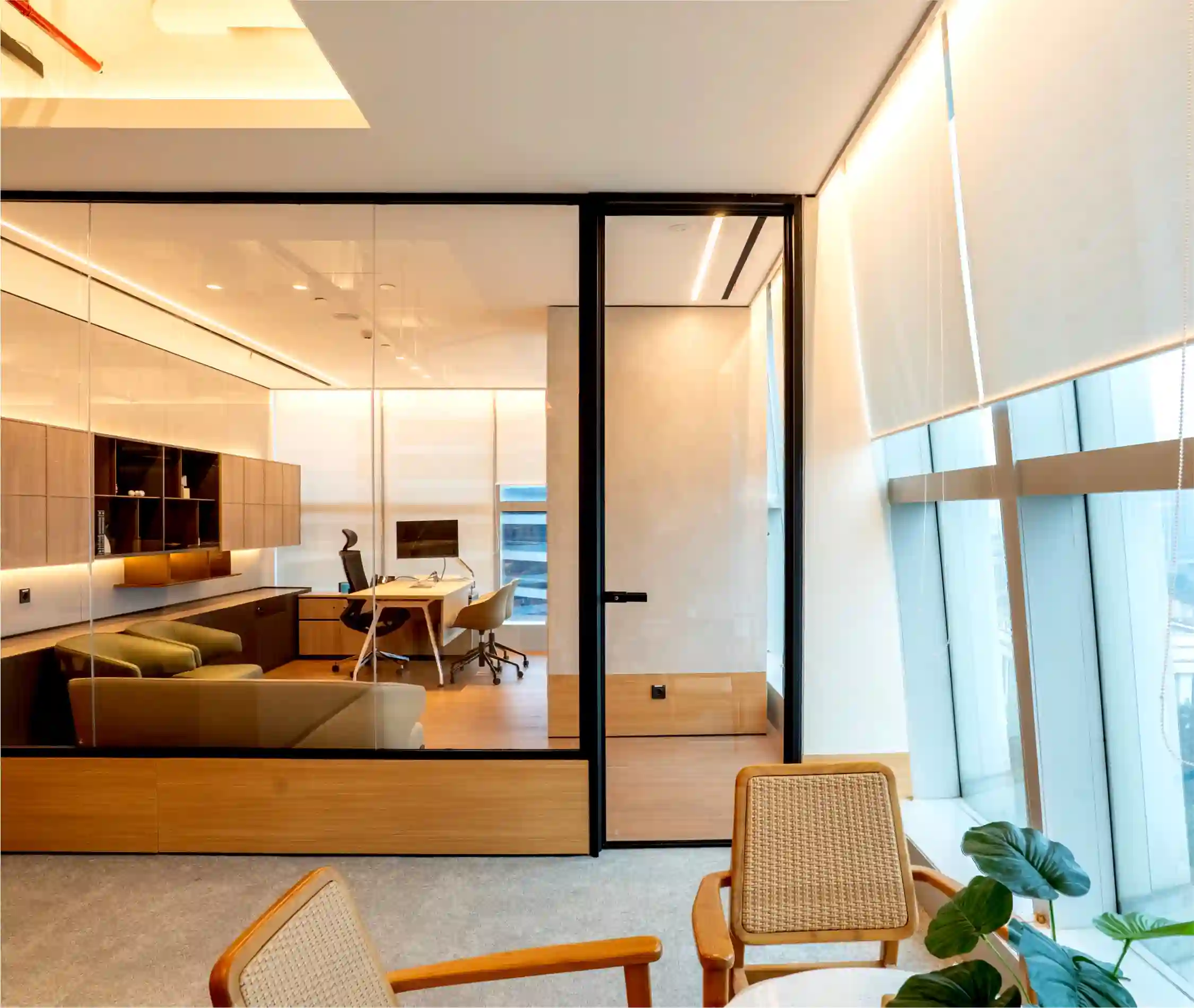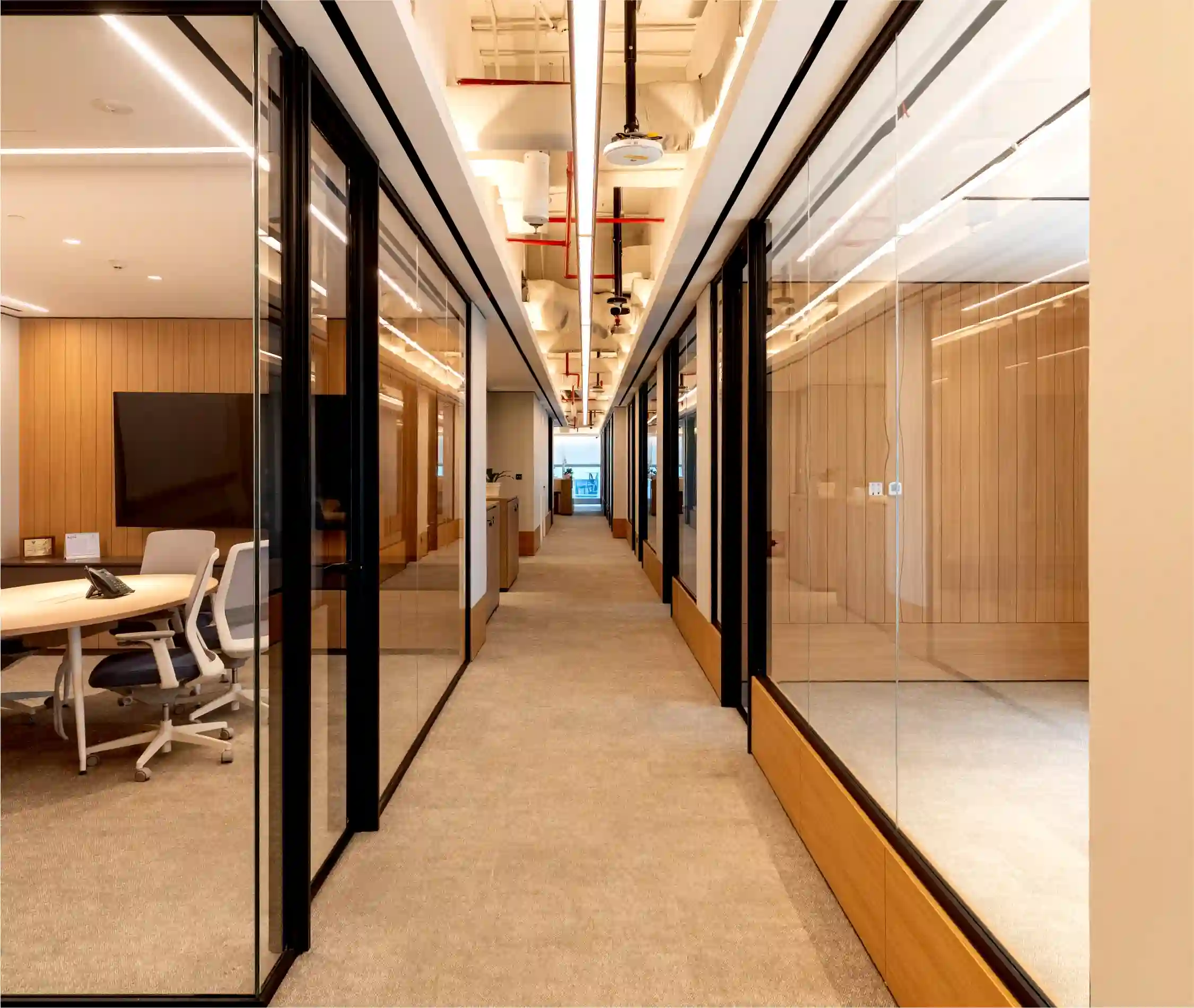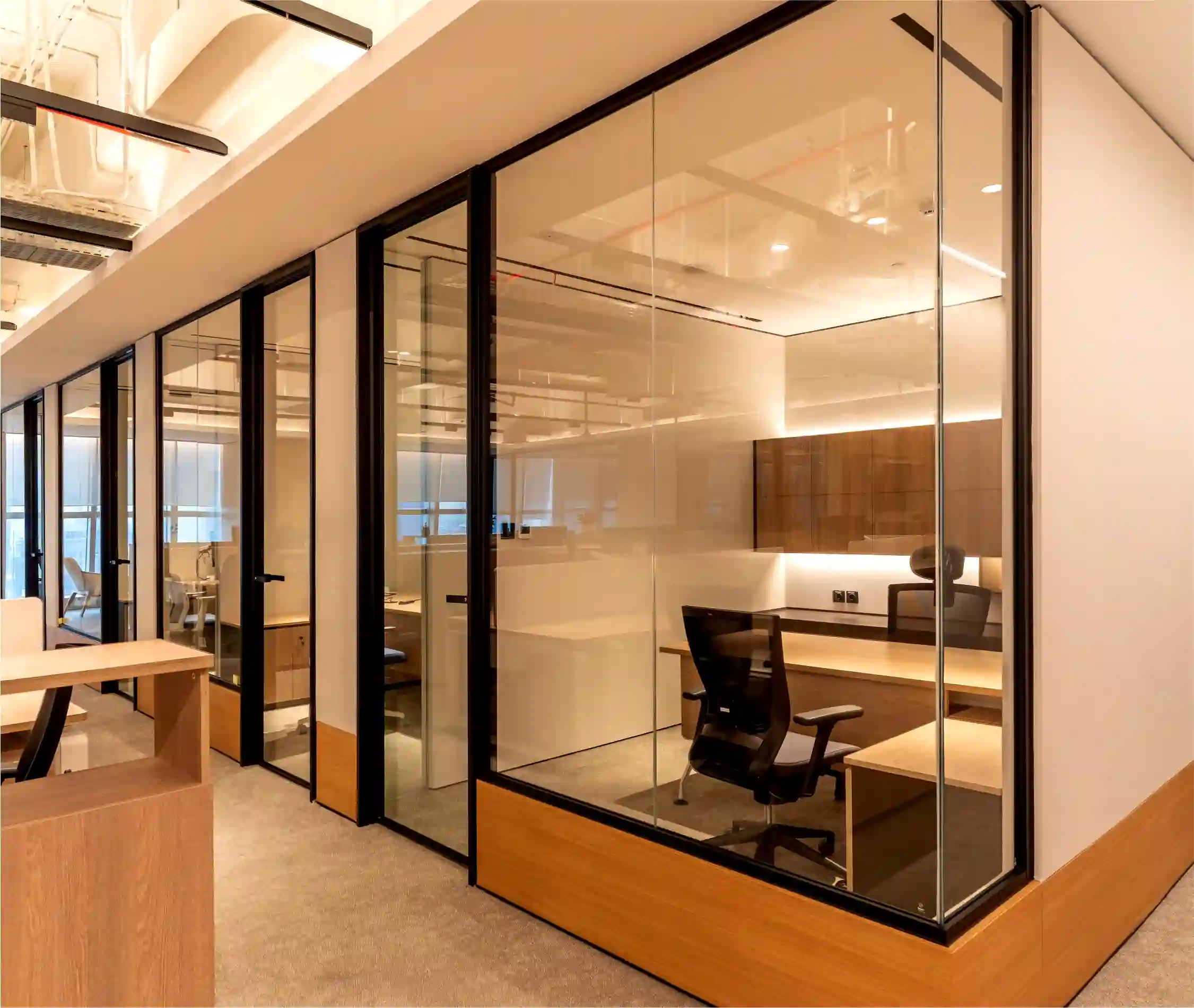 Desain kantor Saratoga tampil bersih dan profesional dengan kombinasi Slim Office dari Roxy Glass. Memberikan pencahayaan alami maksimal dan kesan modern.